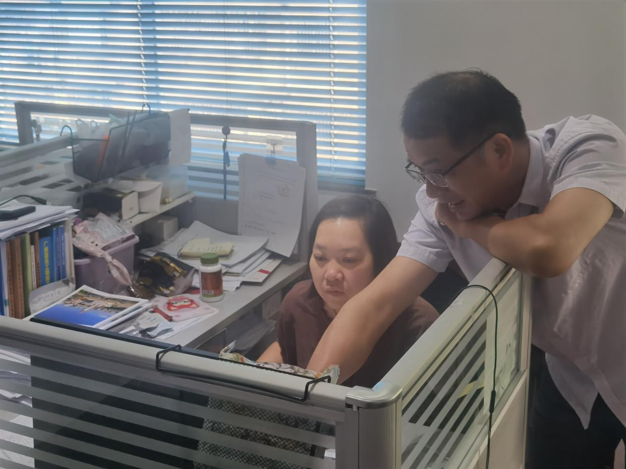 总工办总工黄群在检查分公司成果文件并指导业务员规范开展相关工作