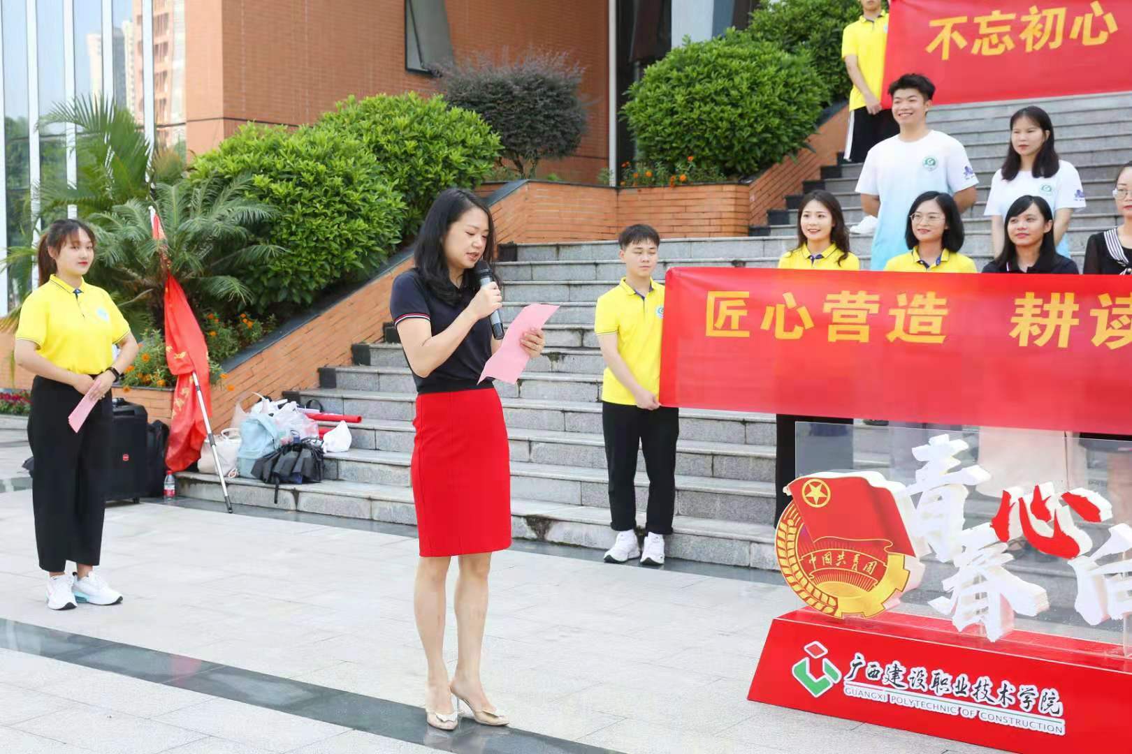 出征仪式合影 广西建设工程造价管理协会党支部书记王燕蓉在出征仪式上讲话。她说,新时代青年既是实现第一个百年奋斗目标的经历者、见证者,更是实现第二个百年奋斗目标,建设社会主义现代化国家的生力军。对此,她希望同学们能够通过此次“科技、文化、卫生”三下乡活动,深入了解我国乡村振兴战略,并通过实践把服务的热情和学到的知识运用到新农村的建设中。