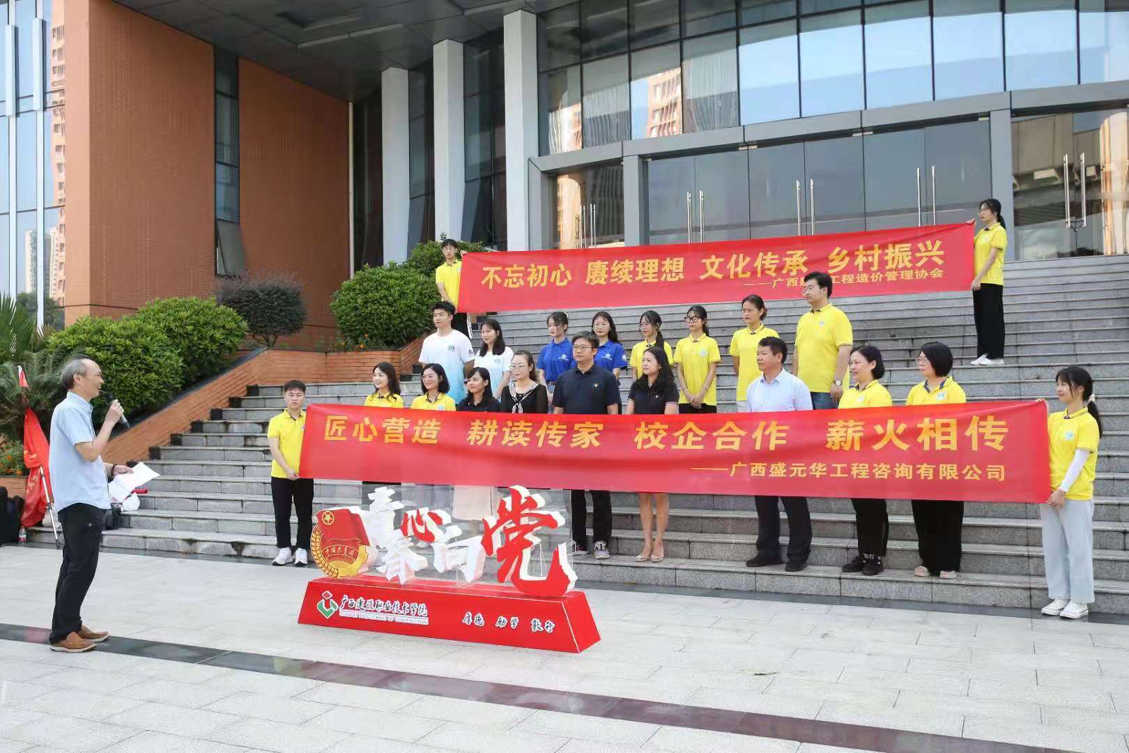 黄艺副总经理在出征仪式上讲话 据悉,我公司去年与广西建设职业技术学院校企合作的“三下乡”社会实践活动收到了良好的社会效果。再次出征启程,依托学校“三全育人”示范系平台,“双高”院校建设工程管理专业群建设,融合互联网+项目打造,由广西建设职业技术学院管理工程系、马克思主义学院联手组织,得到我公司与广西建设工程造价管理协会全程指导,既加强了校企合作联系,又体现了行业企业的社会担当,更借助实践检验育人实效,实现了学校、行业、企业“三线交融”,汇聚校行企力量,助力乡村振兴。