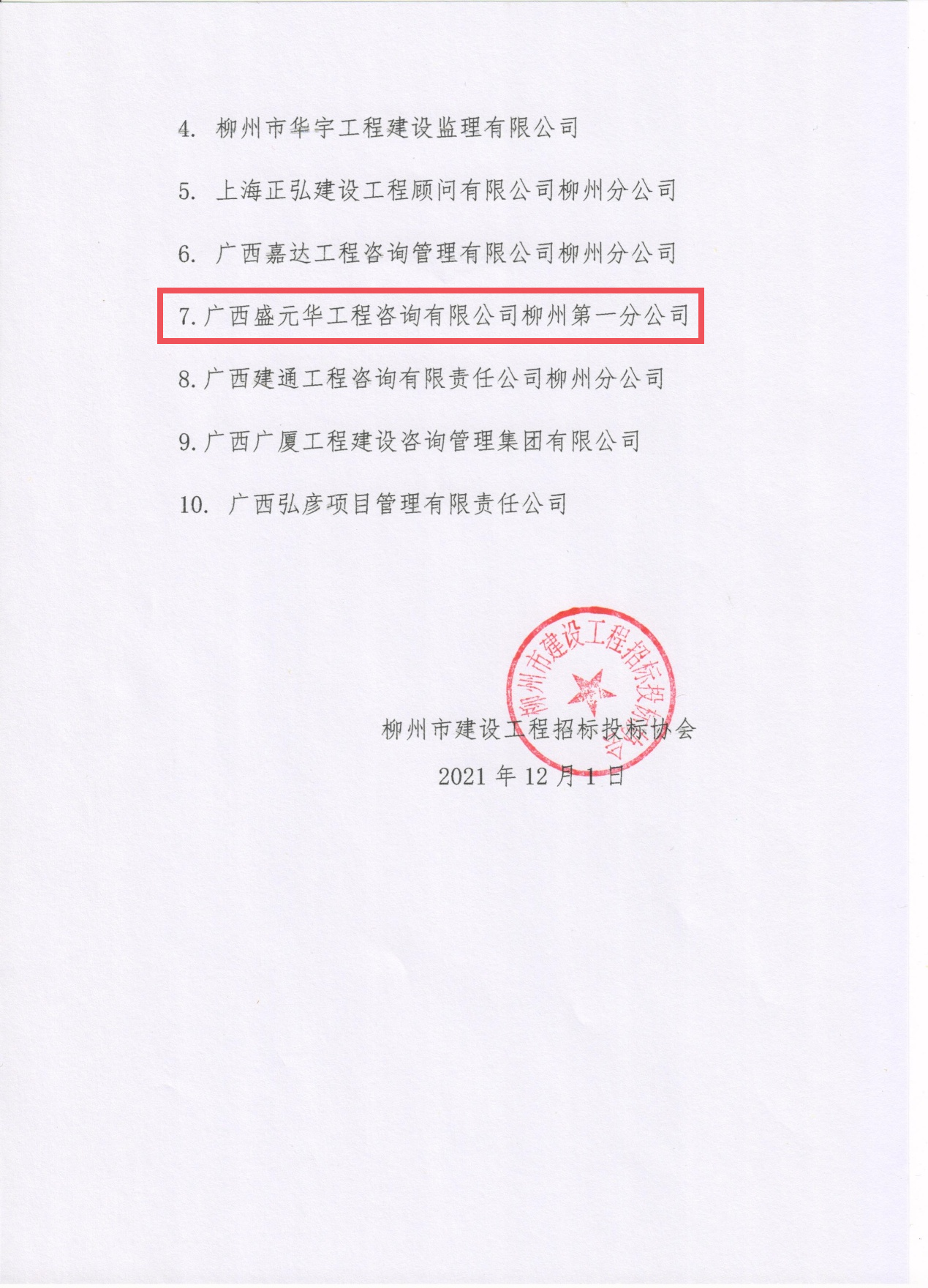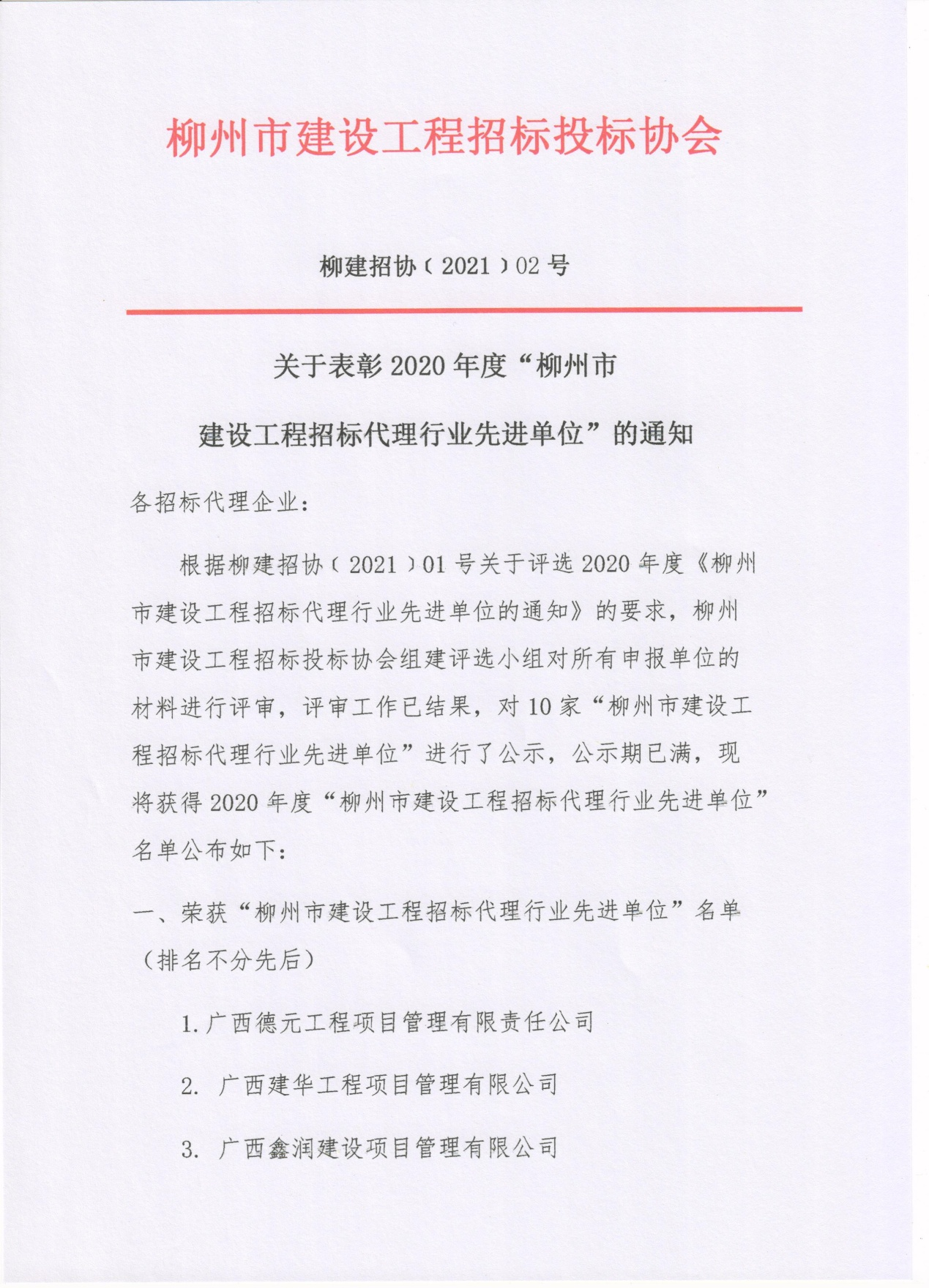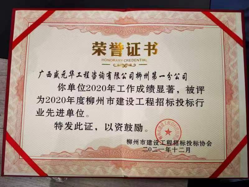 喜讯!热烈祝贺广西盛元华集团旗下柳州一分公司荣获2020年度"柳州市建设工程招标代理行业先进单位"的荣誉称号 |